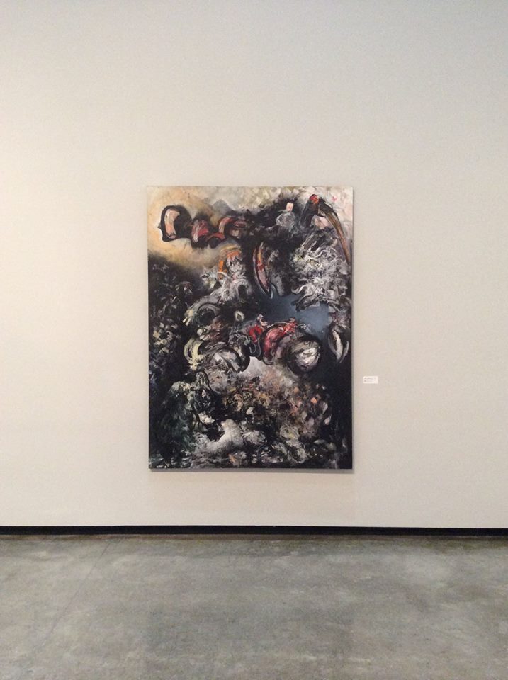 Figueroa's paintings are incredibly detailed. His dark and ominous artwork shows an abstract expressionist and surrealist fusion with a Hans Hoffman-like Push and Pull dimension coupled with an automatism mindset.  Very sublime. Otis's work harkens the minimalism of the 70's. I enjoyed his balance and subtle color changes as one tone blended to another slowly and suredly.  Daniel Ruanova of "TJ in China's" pieces were impressive and showed a blend of Pop-Art, Street Art and Abstract Expressionism. His art stood out to me as one of the best paintings in the exhibit. I enjoyed the dark color and neon bright contrasts.