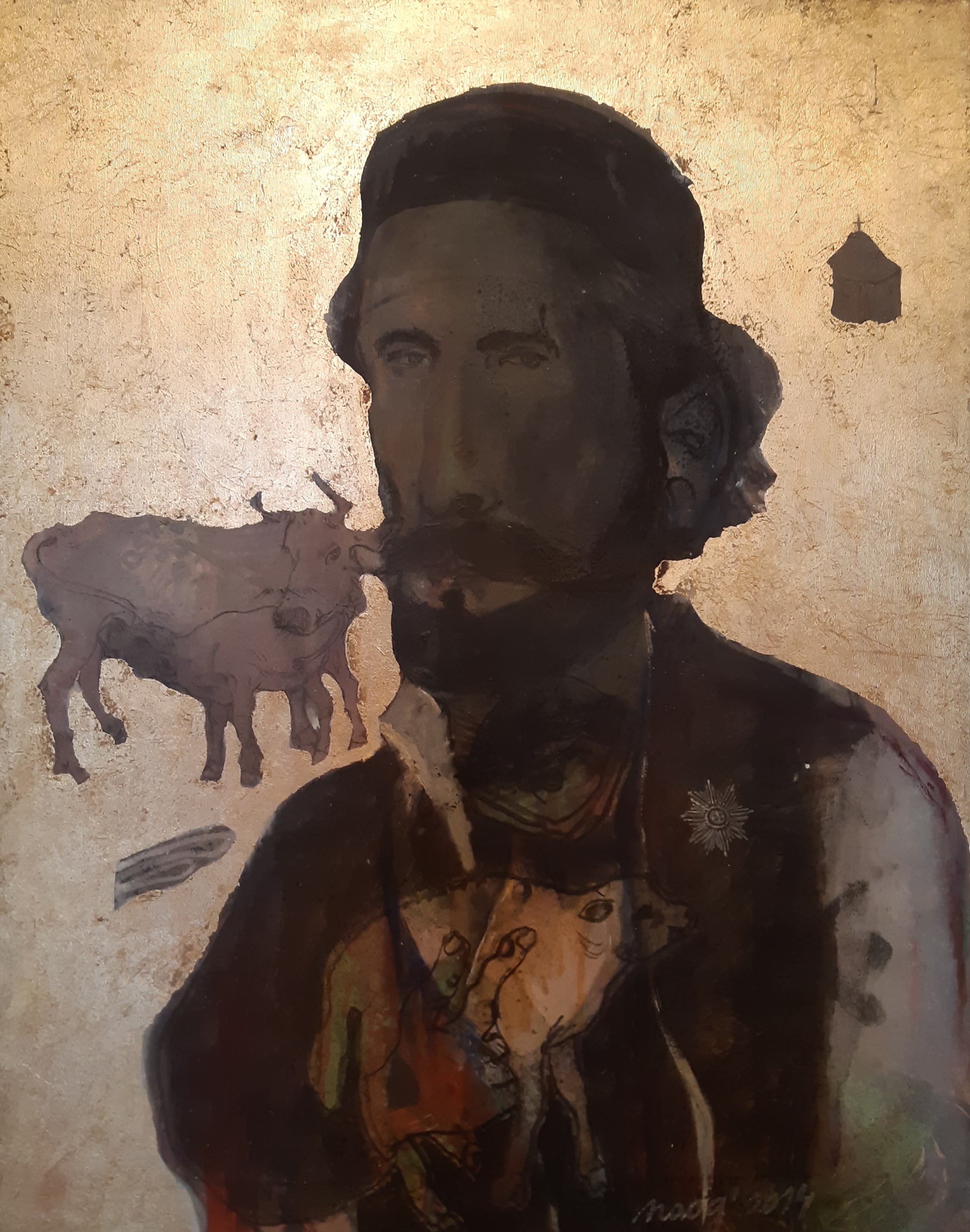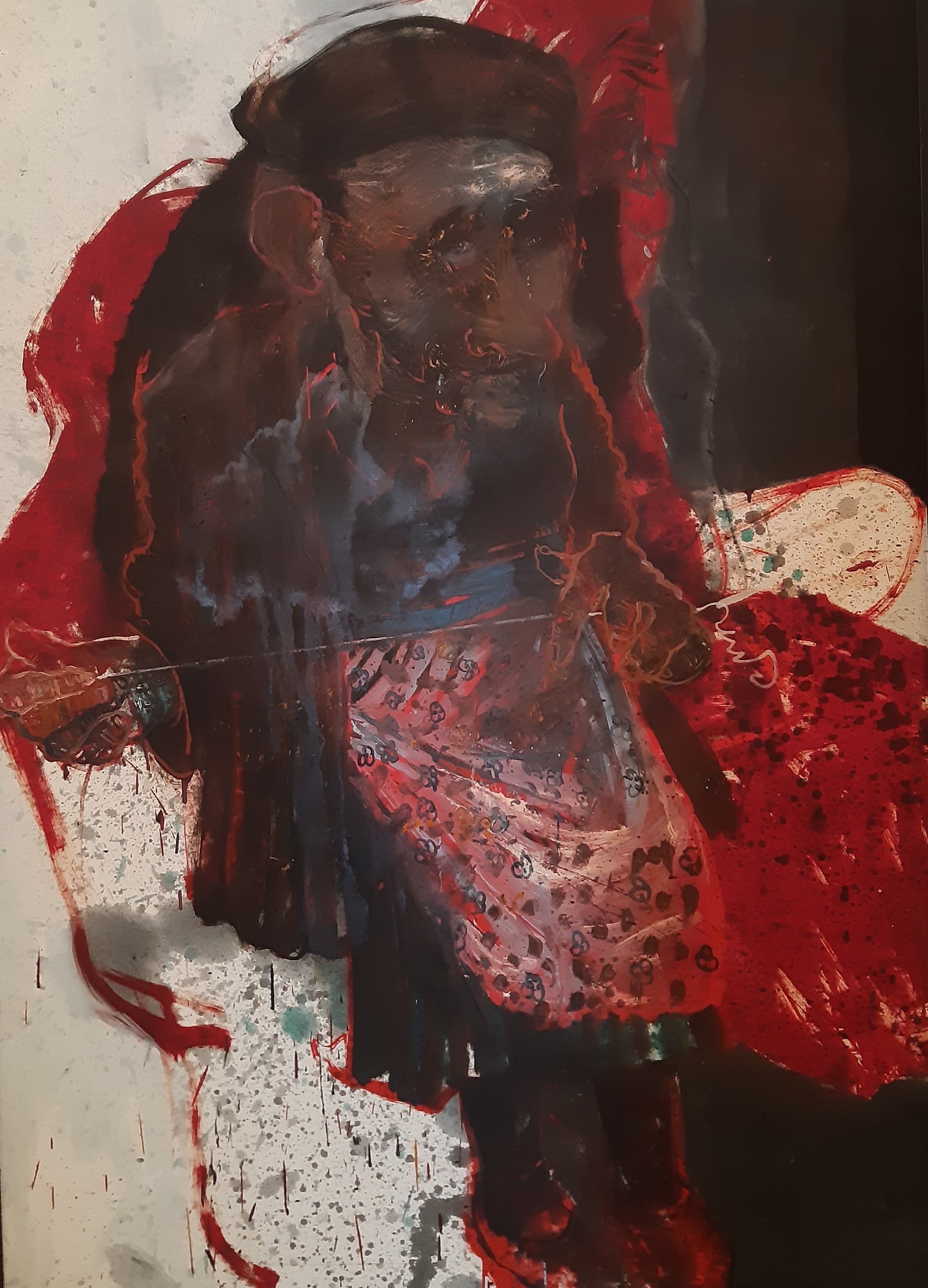 Naod explores, deeply in his highly abstract figurative compositions, the human psyche. Death, life, war, nationality, identity, triumph, pain, suffering, insanity and man's vices, struggles and failures, all find a place in Naod's art. The faces show this poetic catharsis mixed with some animal and other symbolic imagery. Dark reds and regal golds explode onto canvas. The mostly male faces are twisted, grotesque  with expressions searching for answers but not gorey. This art is heart-felt, there is real pain here. The artist knows his subject and I found the work refreshing in a mostly conceptual art world we are accustomed to seeing these days. Unless we are talking about the amateur splatter artists on Instagram. This is far removed from that platform, this is museum quality artwork deserving of attention and praise.